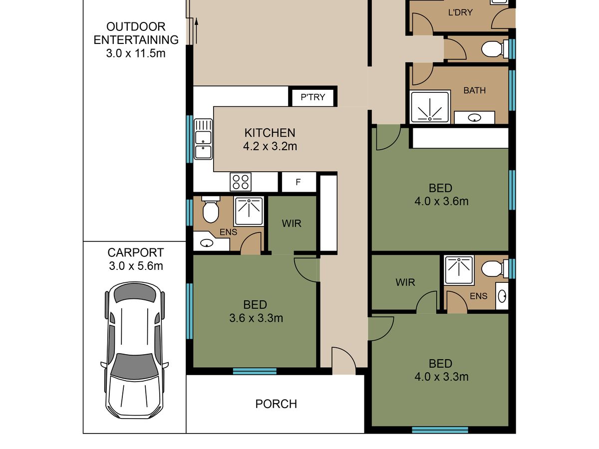 Two of the bedrooms feature private ensuites, while all include built-in wardrobes. The open-plan living area is filled with natural light and air-conditioned for year-round comfort. Fully tiled throughout, the home is both modern and easy to maintain.