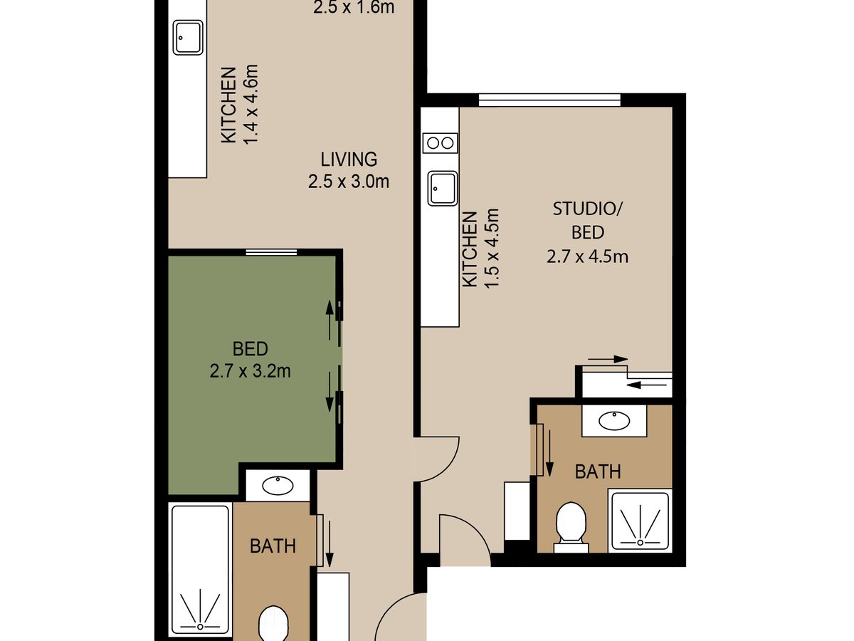 • Dual key flexibility: 1 bedroom apartment + studio apartment on one title