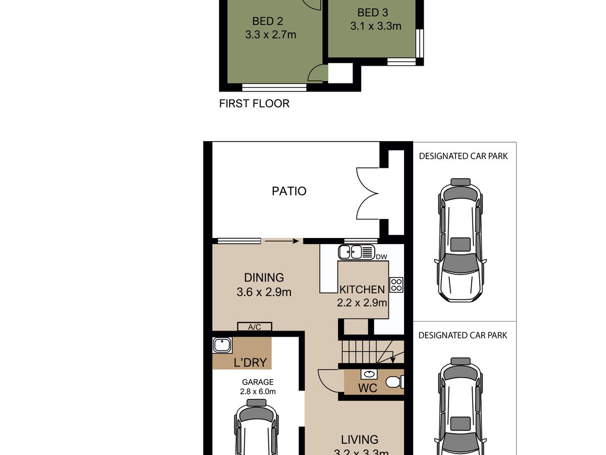 • Practical two-level layout separating living and bedrooms